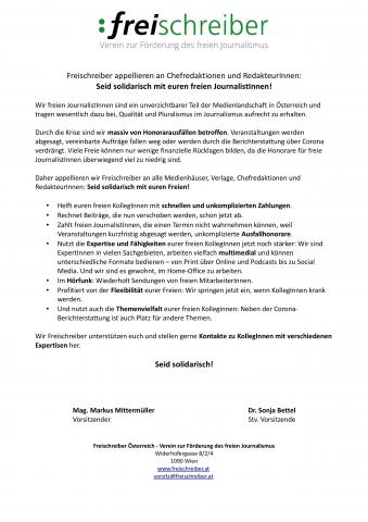 Daher appellieren wir Freischreiber wie auch unsere Freischreiber-KollegInnen in Deutschland (https://www.freischreiber.de/aktuelle/seid-solidarisch/) an alle Medienhäuser, Verlage, Chefredaktionen und RedakteurInnen: Seid solidarisch mit euren Freien!